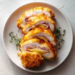 A delightful dish combining succulent chicken, ham, and Swiss cheese wrapped in a golden breadcrumb coating.