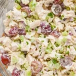 A vibrant chicken salad filled with tender chicken, crunchy celery, and refreshing grapes, perfect for warm days.