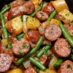 A comforting crockpot dish featuring kielbasa, green beans, and potatoes, perfect for chilly nights.