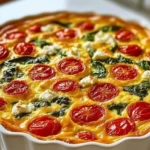 A vibrant and comforting crustless quiche packed with spinach, tomatoes, and feta cheese, perfect for brunch or a light dinner.