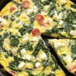 A delightful frittata packed with fresh spinach, grape tomatoes, and feta, perfect for breakfast or brunch.