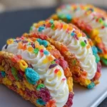 Fruity Pebbles cheesecake tacos with colorful sprinkles and creamy filling