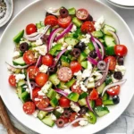 This Greek salad is the perfect balance of crisp and creamy, tangy and savory. It’s not just a salad; it’s a celebration of fresh ingredients! With every bite, the cooling crunch of cucumbers meets the juiciness of tomatoes, while Kalamata olives provide a briny dimension, and the feta cheese adds richness. Topped with a zesty dressing of olive oil and lemon juice, this salad refreshes the palate and complements just about any meal. Plus, it’s incredibly simple to make—perfect for those busy weeknights when you still want to indulge in something healthy and delicious.