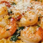 A comforting one-pan dish featuring creamy orzo pasta combined with tender shrimp and rich Parmesan cheese.