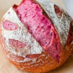 A delightful twist on classic sourdough bread that features a vibrant pink color from beet powder, combining unique flavor with stunning appearance.