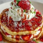 Serve the pancakes warm and pile on the cream cheese mixture. Top with a generous swirl of whipped cream and fresh strawberries. This final touch adds a burst of color and freshness that’s simply irresistible!